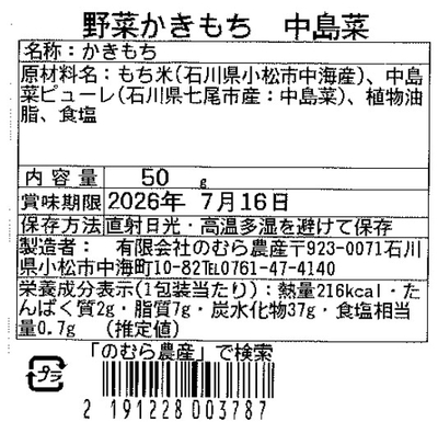 漁業が盛んですが、小菊かぼちゃやころ柿など特産野菜もあり、中でも中島菜は古くから食べ継がれてきた能登伝統野菜であり、高血圧予防成分を多く含み、ほろ苦い風味とシャキシャキとした食感が特徴の七尾市独自の緑黄色野菜です。そんな中島菜ピューレを餅に練り込んで作ったかきもちです。