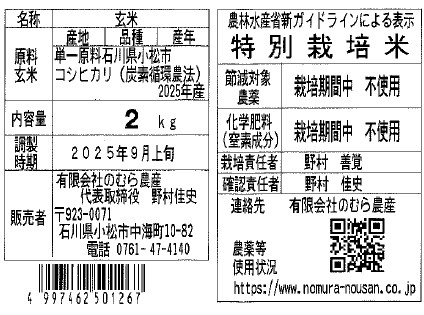 農林水産省ガイドラインにより表示していますが、当社では農薬を50%以下のところ100%減で、さらに化学肥料も50%以下のところ100%減の使用しない栽培方法でお米作りをしております。できる限りの安心と安全をお届けいたします。